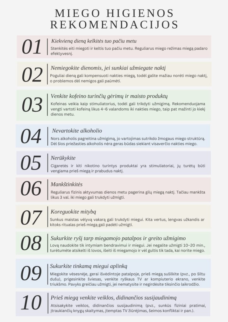Anot dr. E. Sakalauskaitės-Juodeikienės, siekiant pagerinti miego kokybę, labai svarbu laikytis miego higienos rekomendacijų – taisyklių, nurodančių, kaip užtikrinti gerą miegą: „Miego higiena – svarbi priemonė gydant nemigą. Miego higienos rekomendacijos yra nesudėtingos, prieš pradedant jų laikytis, nereikia specialaus apmokymo.“